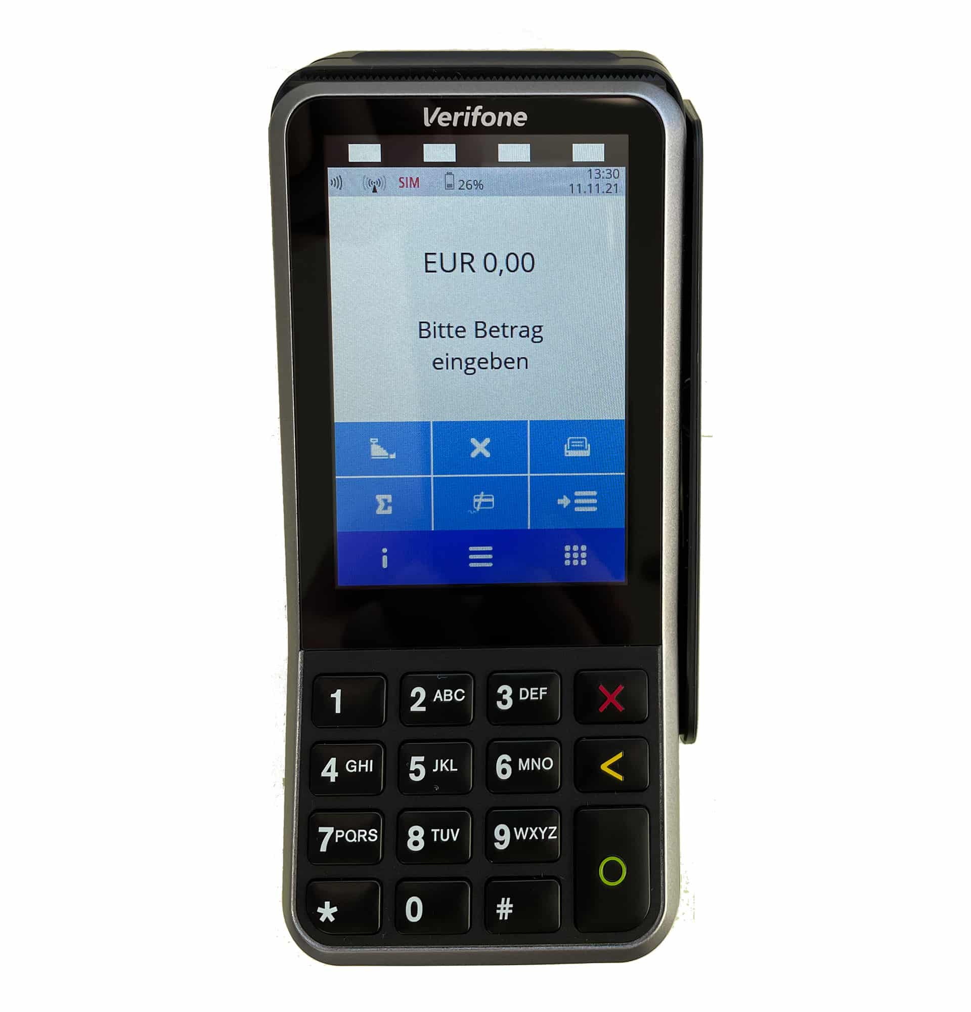 Verifone V400m mieten oder kaufen. Mit dem Karten-Terminal ist eine sichere und schnelle Verbindung aller Kartenzahlungen möglich. Über Ihr WLAN-Netz können sie das EC-Lesegerät einfach verbinden und überall in der Reichweite Ihres Netzes die Kunden einfach und bequem bezahlen lassen. Mobile Kartenzahlung.