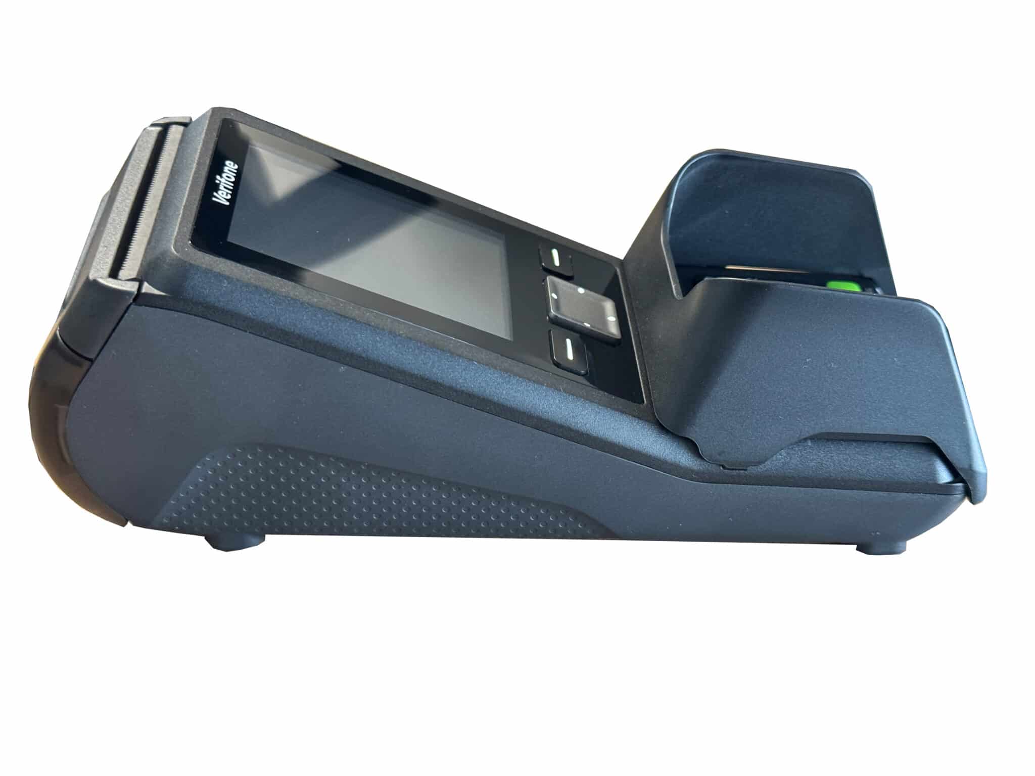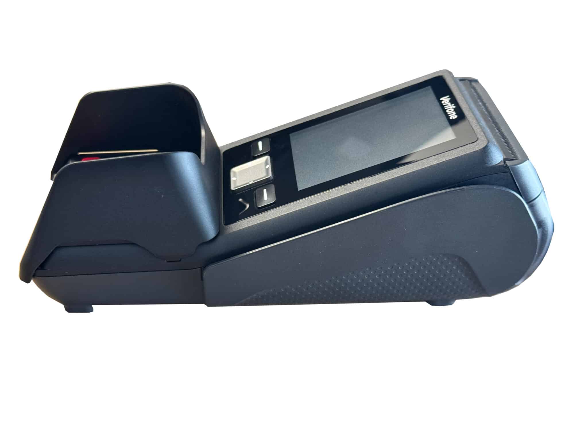 Die meisten Kunden wünschen einen sofortigen Beleg für ihre Zahlung, den das Terminal auch im Offlinebetrieb mit dem integrierten Drucker liefert. Das macht das V200c von Verifone interessant für alle Händler. Das Fach des Thermografikdruckers ist transparent und lässt daher die Funktionstüchtigkeit und den Stand der Papierrolle jederzeit erkennen. Der Kartenschlitz ist leicht erhöht, was den Komfort beim Einstecken verbessert.
